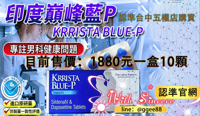 正品 印度巔峰藍P(KRRISTA BLUE-P)印度 Ether Pharma Pvt. Ltd. 原廠生產,所有包裝必須清楚標示 公司全名GMP 認證編號,以確保製程符合國際藥品品質標準。