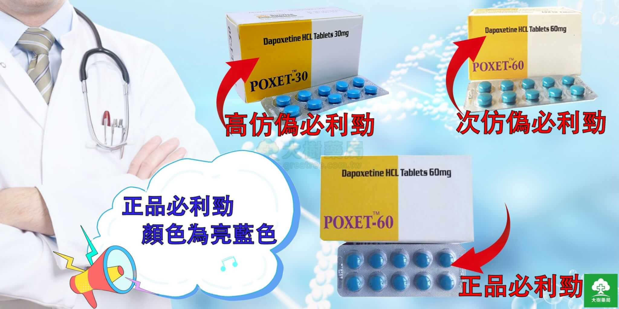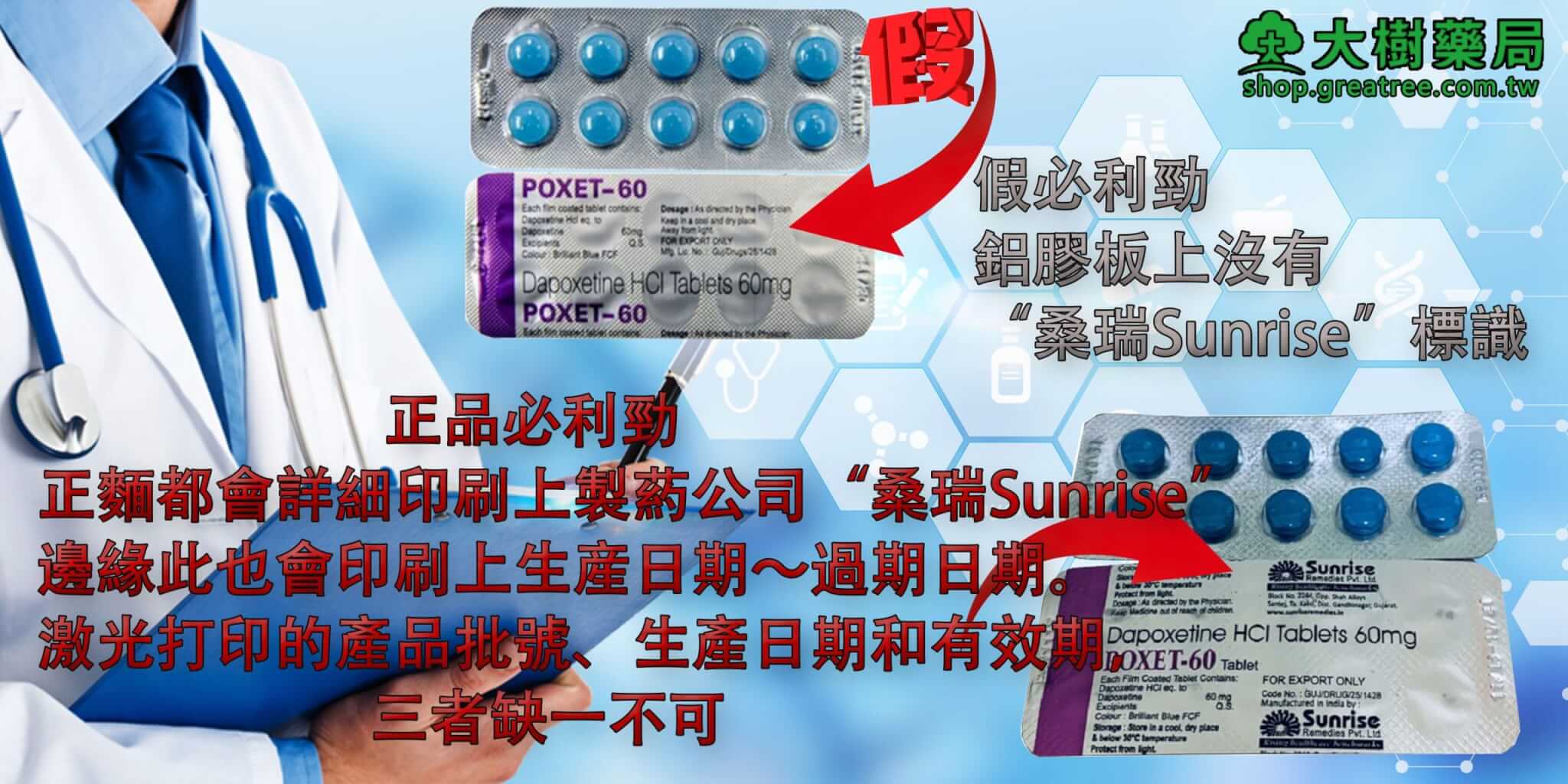 大樹藥局與印度必利勁原廠 Sunrise Remedies 藥廠 正式合作,引進學名藥版達泊西汀(Dapoxetine 60mg),免處方即可購買,並提供以下保障: