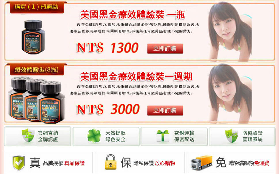 美國黑金(USA Black Gold) 為進口男士滋補保健品,具提升體力、強化性能力與延長持久力等功效。以下為官方售價方案: