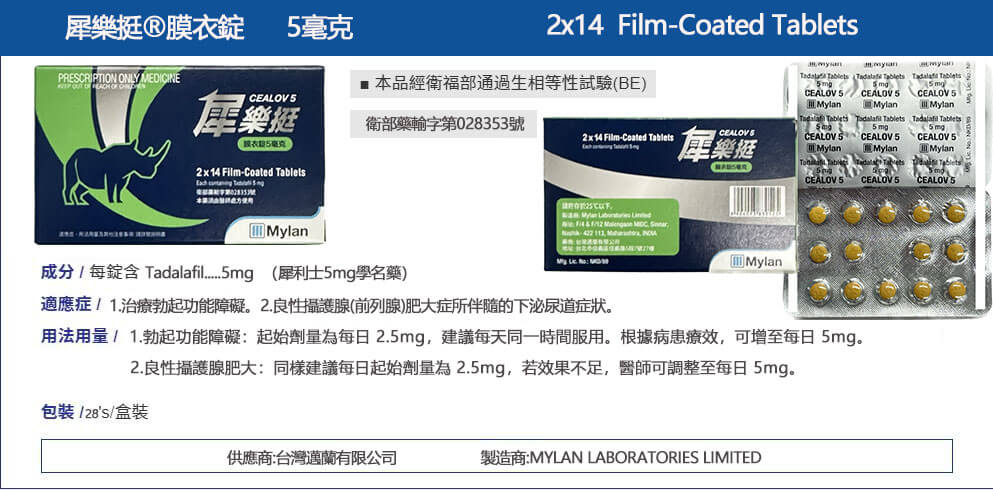 犀樂挺 Cealov 5mg 膜衣錠|每日型犀利士學名藥 28錠/1盒