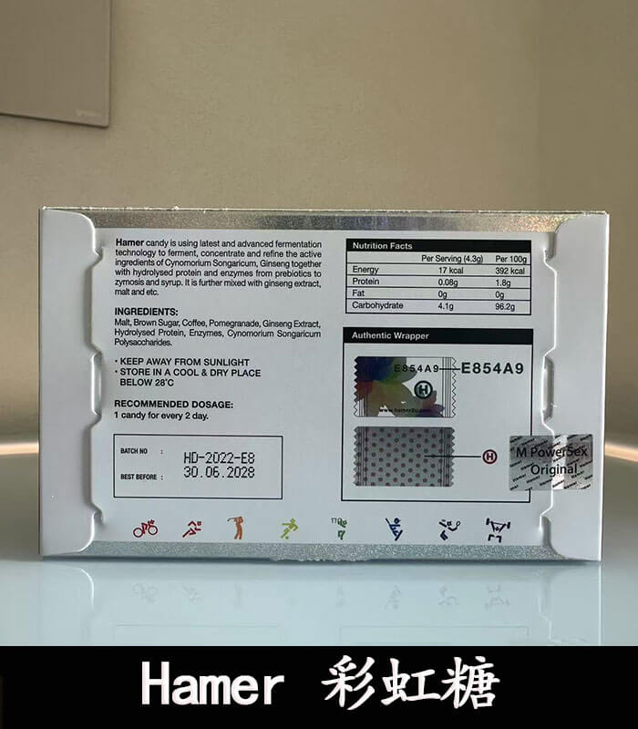 汗馬糖 Hamer 彩虹糖是馬來西亞原産的一種能量補充糖果,在台灣亦陳作汗馬糖、悍馬能量糖及Hamer糖、悍馬糖稱謂。汗馬糖在增強男性活力方麵頗具益處,然而悍馬糖以其純淨無摻雜、無害且無副作用的生産理念與功效,贏得了消費者的青睞,成為增強男性體魄的首選保健品。關鍵在於服用汗馬糖不僅促進男性機能的顯著提升,還能有效修複身體受損的多種組織,並對提升男性精力、滋養內髒器官均有顯著裨益。