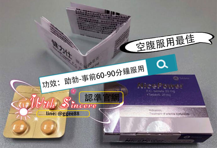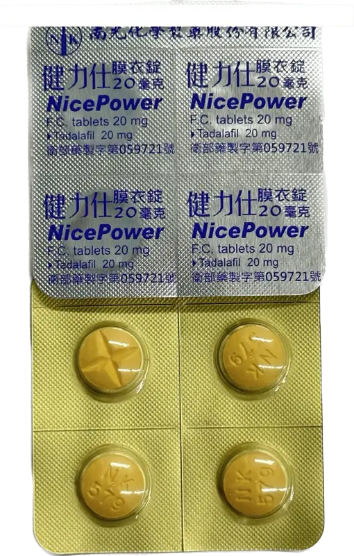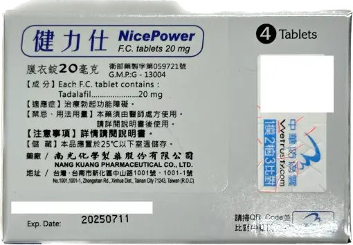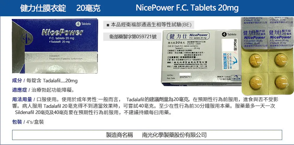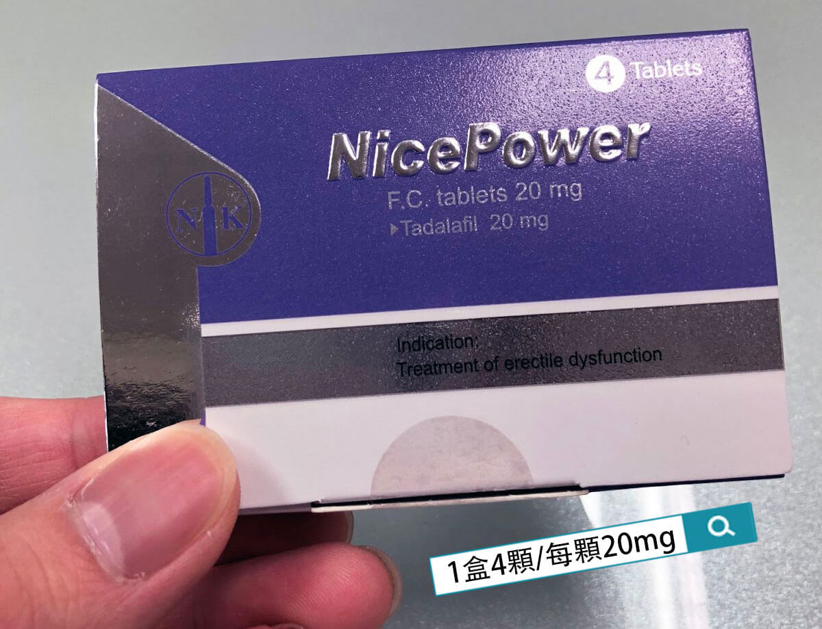 - 每盒含 4 錠 健力仕膜衣錠 NicePower 20mg,每錠含 20mg Tadalafil(犀利士成分)。