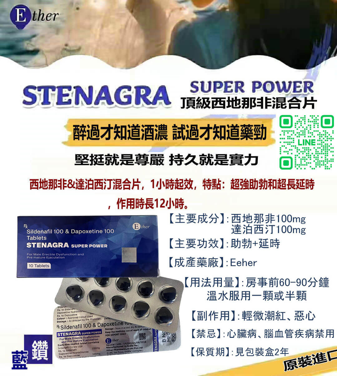 印度藍鑽 Stenagra Super Power 由印度 AMBITREE 藥廠研製的超級威而鋼,採用雙效配方,結合 西地那非(Sildenafil) 的強效助勃與 達泊西汀(Dapoxetine) 的延時作用,一顆即可同時解決 勃起障礙(ED) 與 早洩(PE)。不論是追求堅挺硬度,還是延長激情時刻,印度藍鑽都是兼顧硬度與持久力的男性首選。