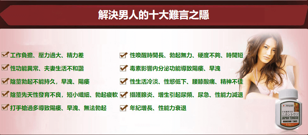 日本藤素是唯一的一種100%純天然,安全,有效的男性功能藥物,它可以解決男人性生活中的尷尬難題。隻有日本藤素可以帶給男性朋友更多的男性魅力,性能力,和性是快感,而且完全沒有任何健康風險,並且不需要醫生處方。這是因為日本藤素結合了天然成分和被臨床證明有效的濃度值,從而最大程度提高了您的性慾和性能力。