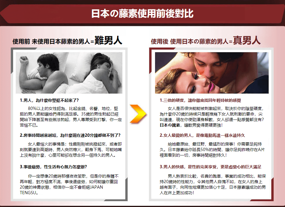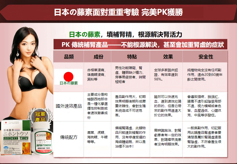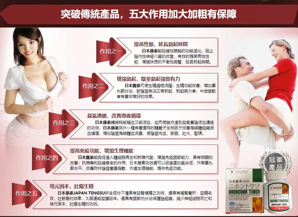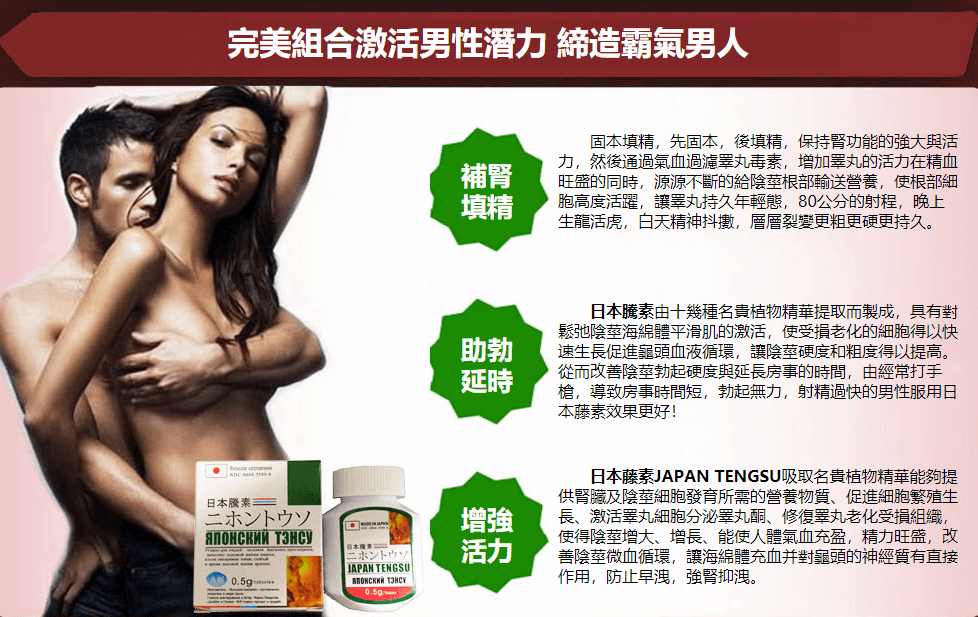 日本藤素(Japan Tengsu)是一款結合現代科技與傳統草本智慧的男性保健配方,專為改善性功能障礙與延緩性衰老而研製。其主要功效涵蓋以下幾大面向: