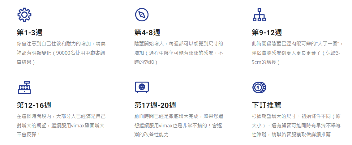 - 第12-16週 在這個時間段內,大部分人已經滿足自己對增大的期望,繼續服用vimax鞏固增大不會反彈!