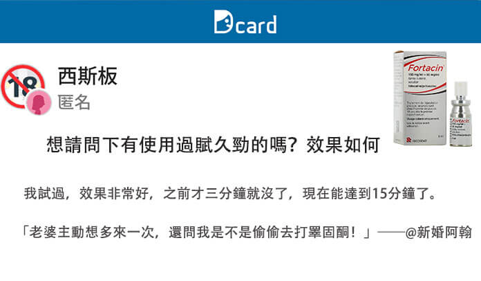 近幾個月,Dcard 上關於「賦久勁 Fortacin 延時噴霧」的討論持續升溫🔥,尤其在西斯板、感情板與醫學板,掀起一波男性延時產品熱潮。從初次使用的學生族、忙碌上班族到已婚男性,許多網友真實分享了使用賦久勁後延長性愛時間、改善表現焦慮、提升自信的轉變。
